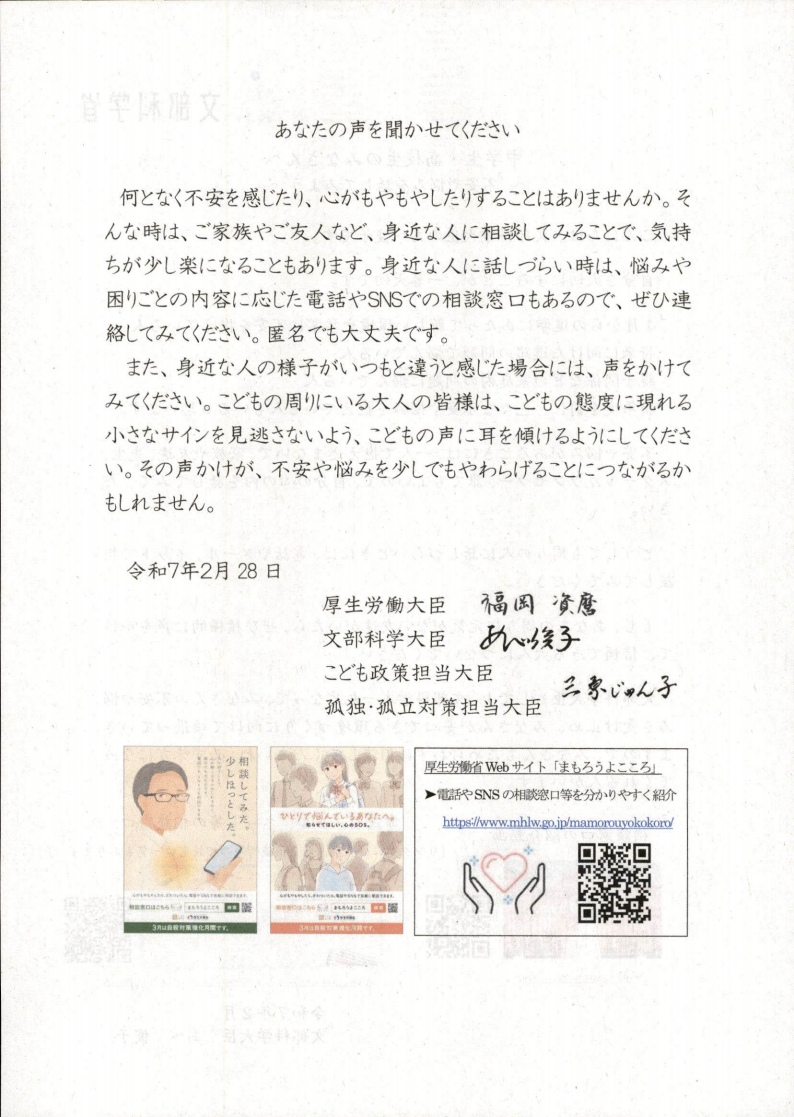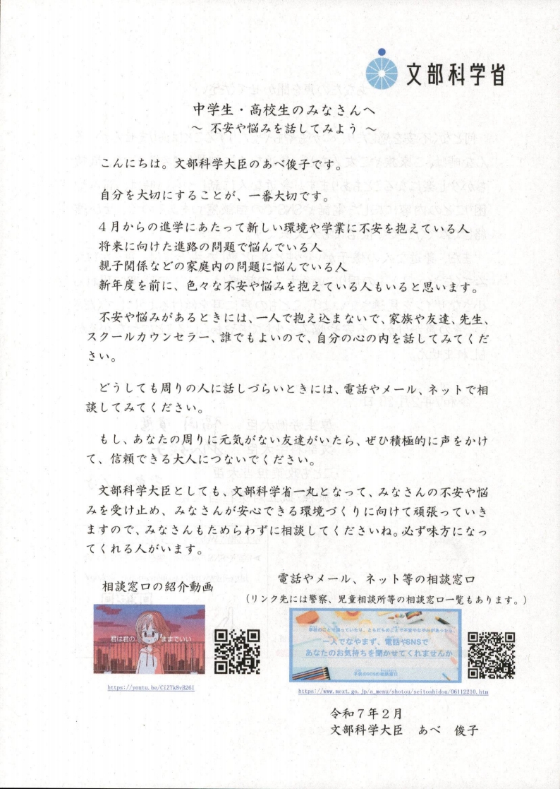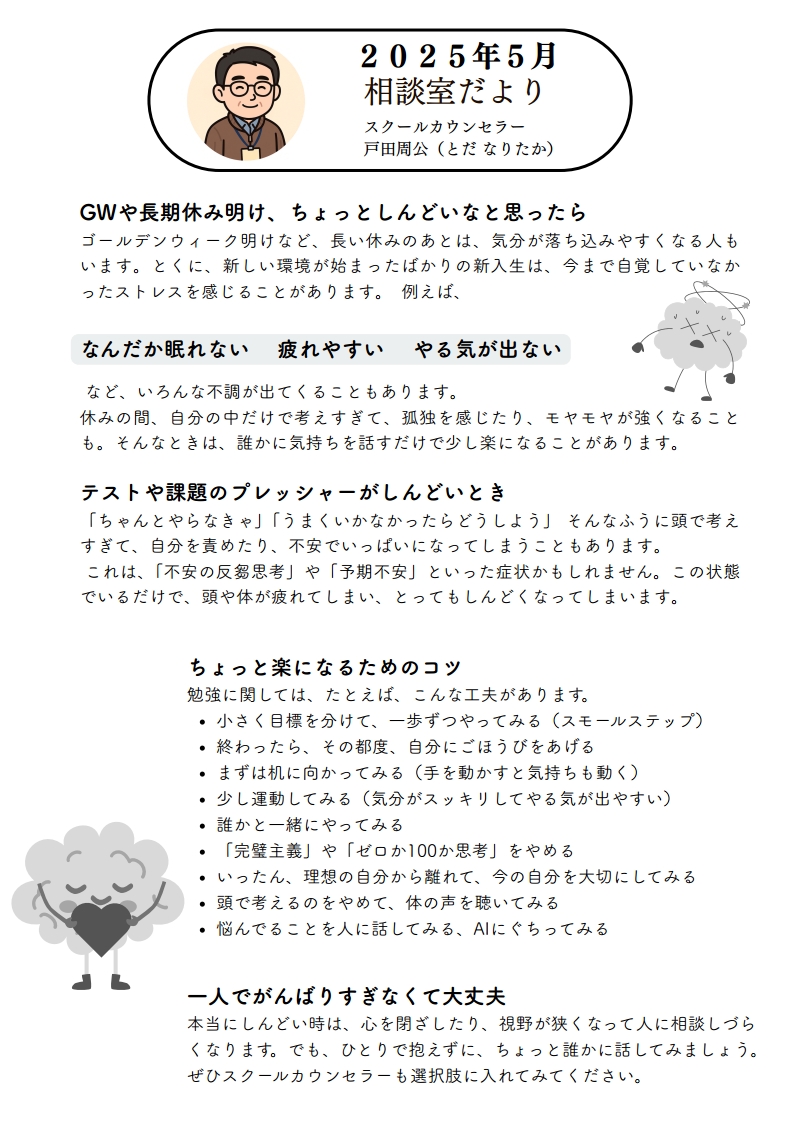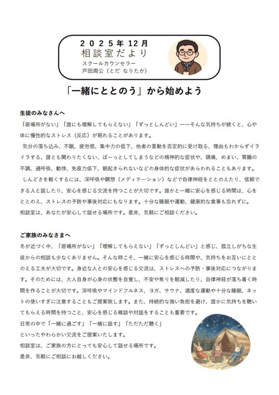 SCより生徒・保護者の皆様へ 相談室だより12月号 相談室だより2025年12月竹園高校.jpg SCより生徒・保護者の皆様へ 相談室だより9月号 相談室だより9月号.jpg ちょっとしんどい時に 相談室だより5月号 ちょっとしんどい時に 相談室だより5月号.jpg
