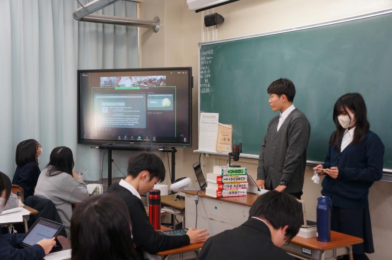 令和7年12月22日(月)、10月に訪韓した生徒と東新科学高校の生徒による合同探究プロジェクト中間オンライン発表会を実施しました。発表では、日韓の水質汚染の比較、抹茶の違い、生成AIの活用など、多様なテーマについて研究成果が報告されました。発表後には、2年7組の生徒から積極的に質問が寄せられ、意見交流が行われました。
