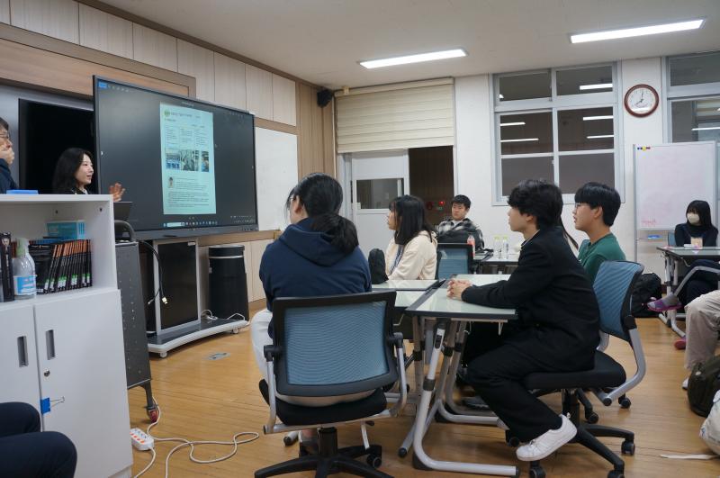 特に印象深かったのは、1年生約320名による「探Q(探究)」の授業での交流です。韓国の教員が各クラスに分かれて参加し、生徒たちは日本の文化や学校生活を英語で紹介したり、韓国について質問したりと、積極的なコミュニケーションが行われました。生徒にとっても、国際的な視点を育む貴重な機会となりました。参加した1年生の生徒より「韓国の先生方が日本について詳しくて驚いた。日本についてもっと勉強したいと思った」という感想がありました。