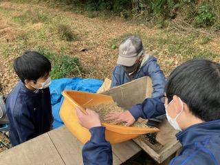 12月6日(土)午後、JRC部員4名・顧問教諭・ALTの計6名で、「脱穀・唐箕・籾すり」の作業に参加しました。6月に自分たちの手で植えた苗を11月に収穫し、それが精米前の玄米へと姿を変えていく過程を実際に体験し、生徒たちは深い感慨を抱いていました。特に、昔ながらの足踏み式の機械を使った作業には大変感激しており、稲作に込められた先人の知恵や労力に思いをはせていました。11月の稲刈りは小雨の降る中で行われ、体力的にも大変な作業となりましたが、今回は天候にも恵まれ、爽やかな気候の中で気持ちよく農作業を体験することができました。今年は昨年度より収穫量が多かったようで、指導者の逢坂さんも嬉しそうな表情を浮かべていらっしゃいました。