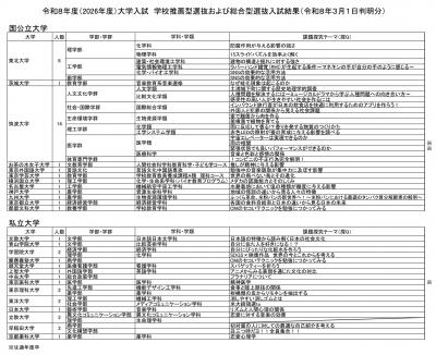 令和8年度 大学入試(総合型・学校推薦型選抜)の結果を公開いたします。 夢の実現に向けて努力を積み重ねてきた生徒たちの成果をご覧ください。教職員一同、目標を達成した生徒たちの健闘を称えるとともに、多大なるご支援をいただいた保護者・地域の皆様に深く感謝申し上げます。 生徒たちは春から新しい環境での挑戦を始めます。彼らのさらなる飛躍を願い、引き続きお力添えをいただけますと幸いです。